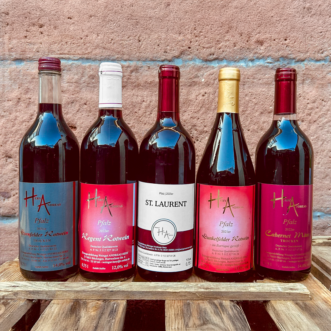 Dieses Paket beinhaltet 5 Flaschen Rotwein. Der gehaltvolle Regent, der vollmundige nach Beeren duftende Dornfelder, der kräftige Cabernet Mitos , den würzigen St. Laurent ,sowie der im Eichenfass ausgebaute Barriquewein Dunkelfelder. Diese sind perfekt für die kalten Winterabende.